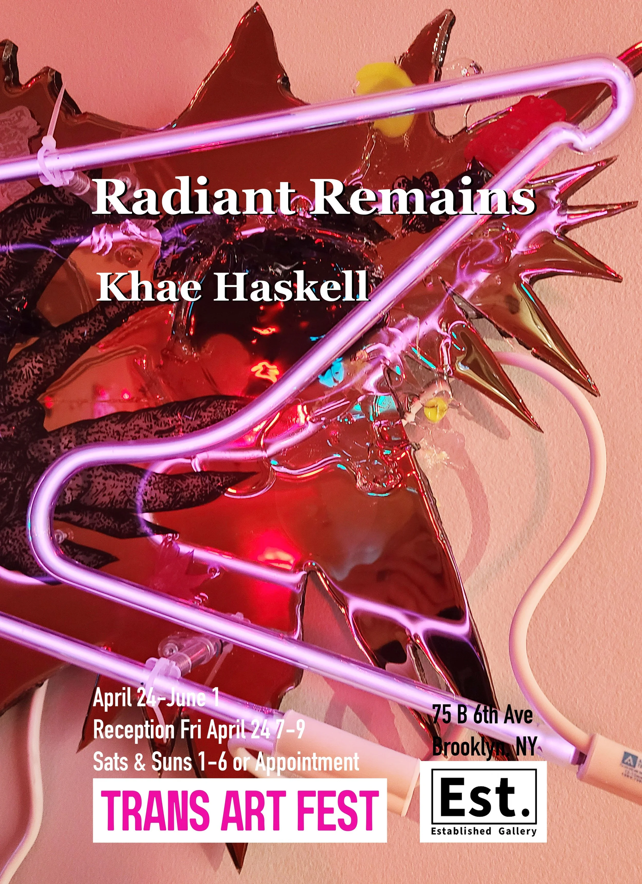 Radiant Remains is a solo exhibition by nonbinary visual artist Khae Haskell. The body of work is a visual expedition of perception in nature. Focusing on illustrating elements of decomposition, Haskell uses various forms of drawing to create sculptural illuminated collages that incorporate natural and synthetic materials, as well as Neon.
